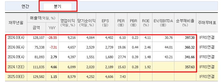 2024년 1분기 실적을 기준으로 보면, 매출 111,035억 원, 영업이익 6,099억 원, 순이익 1,998억 원을 기록했습니다. 전년 동기 대비 개선된 모습이며, 하반기 추가적인 실적 개선 가능성이 존재합니다.