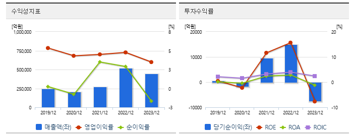 이익률 측면에서는 영업이익과 순이익이 감소하는 모습이 나타나고 있습니다. 2023년에는 순이익이 -7,474억 원으로 적자를 기록했으나, 2024년에는 흑자 전환할 것으로 전망됩니다.