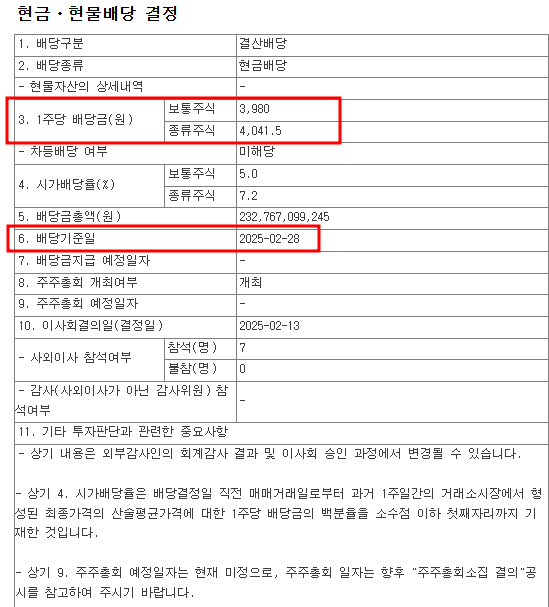 | 1주당 배당금 | 보통주: 3,980원 / 종류주: 4,041.5원 |