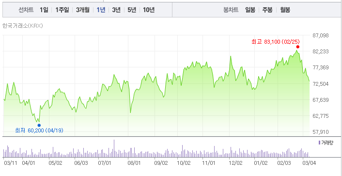 한국금융지주 주가는 52주 기준으로 작년 4월 19일에 최저가인 60,200원을 찍은 후 현재까지 상승추세를 이어오고 있습니다. 다만 3월 들어 하락세를 보이는데 이는 개별 종목의 문제가 아닌 주식시장 전체의 하락세를 반영한 것으로 보입니다.