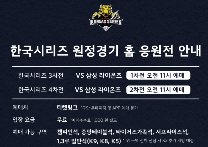 기아 타이거즈는 한국시리즈 원정 경기인 3차전과 4차전 경기를 광주 챔피언스 필드에서 단체 응원전을 계획하고 있습니다. 원정 경기에 가지 못하는 팬들은 입장료가 무료이니 아래 티켓링크 홈페이지에서 선착순으로 예매하시면 단체 응원을 할 수 있습니다.