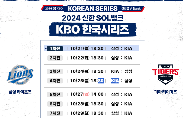 한국시리즈에서 기아와 삼성이 31년만에 다시 만났습니다. 한국시리즈는 7차전까지 열리는데 정규시즌 1위팀인 기아의 홈구장에서 1차전, 2차전, 그리고 5~7차전까지 열립니다. 그리고 3차전과 4차전이 삼성 홈구장에서 열립니다.