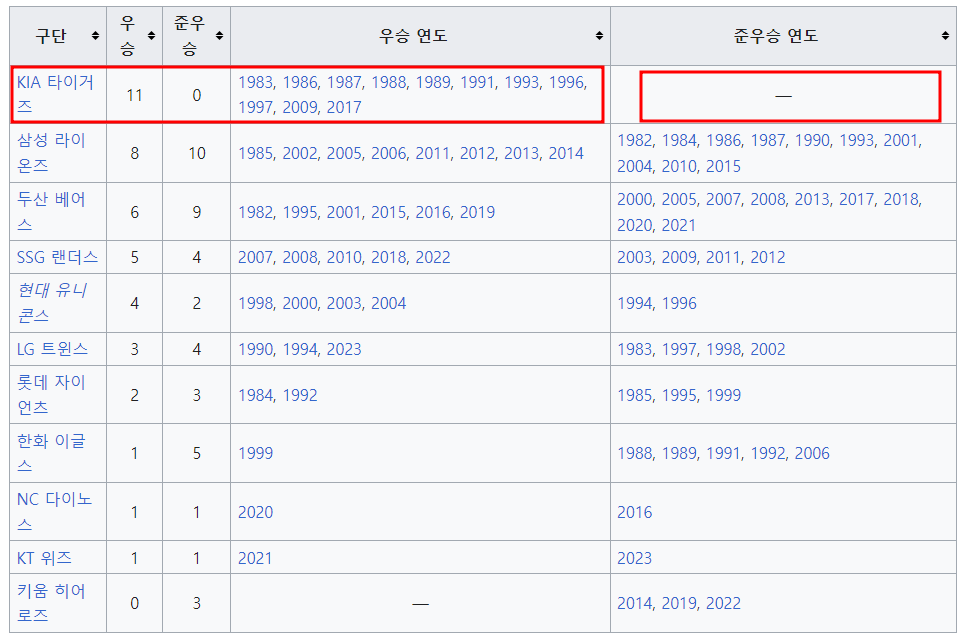 위의 역대 한국시리즈 우승팀을 보면 기아 타이거즈는 준우승이 한번도 없습니다. 이 말은 한국시리즈에 11번 진출해서 11번 우승을 했다는 말입니다. 그래서 올해 한국시리즈 우승도 기대해보게 됩니다.