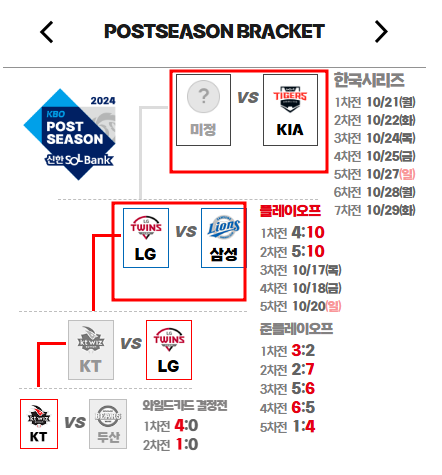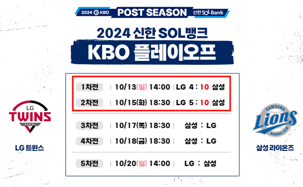 2024 프로야구 포스트시즌은 현재 지난해 우승팀 LG와 올해 정규리그 2위팀인 삼성이 5전 3선승제의 플레이오프를 진행하고 있습니다.