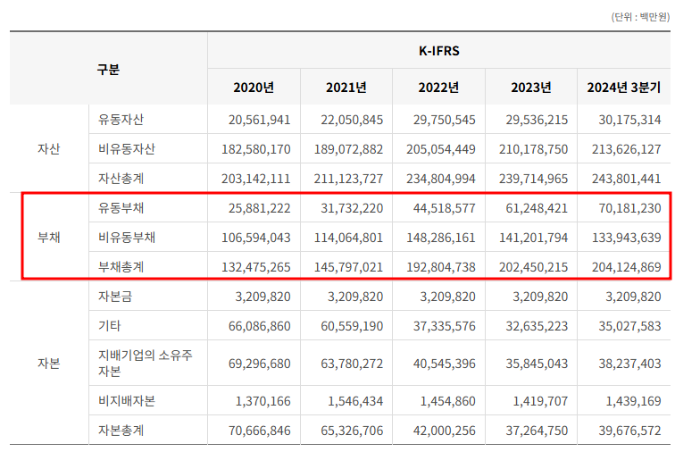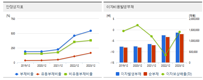 3. 부채 부담: 높은 부채비율(543%)로 인해 금리 상승 시 이자 비용 증가 가능성이 존재합니다.