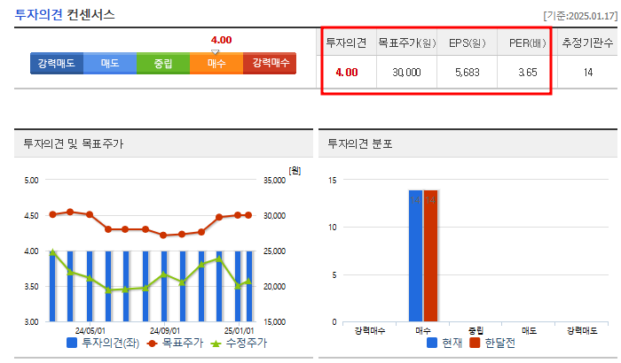 한국전력의 현재 주가는 20,850원이며, 메리츠, 한화투자, 대신증권 등 14개 증권사에서 제시한 목표 주가는 30,000원으로 설정되었습니다.