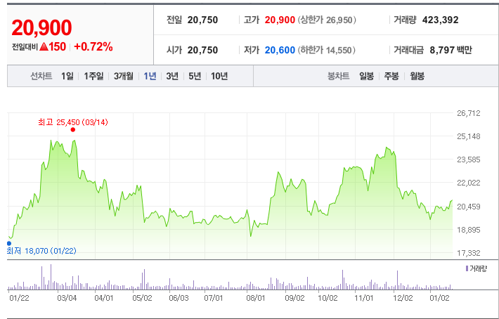 최근 1년 동안의 주가 흐름을 보면, 최고가는 25,450원(03/14), 최저가는 18,070원(01/22)로 나타나 변동성이 존재했습니다.