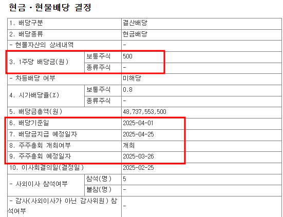 배당을 받기 위해서는 배당락일(2025년 3월 31일 예상) 전에 주식을 보유해야 하며, 현금배당에 대한 소득세도 고려해야 합니다.