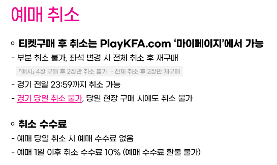 - 티켓 취소 및 환불: 경기일 3일 전까지 취소 및 환불이 가능하나 일정 수수료가 발생할 수 있습니다.