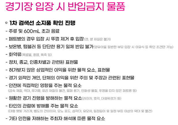 - 반입 금지 물품: 음료 및 주류, 부피가 큰 응원 도구, 소음이 큰 기구는 반입이 제한됩니다.