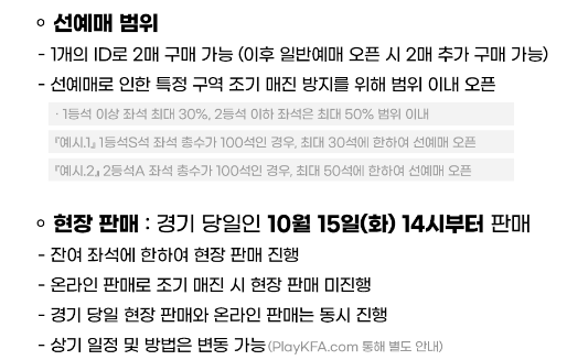 예매는 선착순으로 진행되므로, 예매 시작 시각에 맞춰 미리 로그인하고 좌석을 선택해 빠르게 결제하는 것이 좋습니다. 선예매는 지정된 팬클럽이나 특정 조건을 충족한 사용자들에게 우선 제공됩니다. 선예매 대상자는 플레이 KFA의 VIP회원을 말하는데 레드 등급은 7시에, 그리고 블랙등급은 8시부터 예매할 수 있습니다.