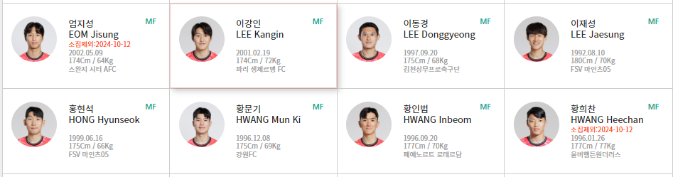 | 미드필더: 황인범 (올림피아코스), 이재성 (마인츠), 이강인 (PSG) |