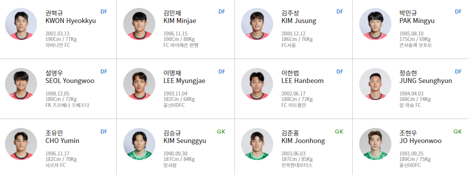 | 수비: 김진수 (전북), 김민재 (바이에른), 김영권 (울산) |