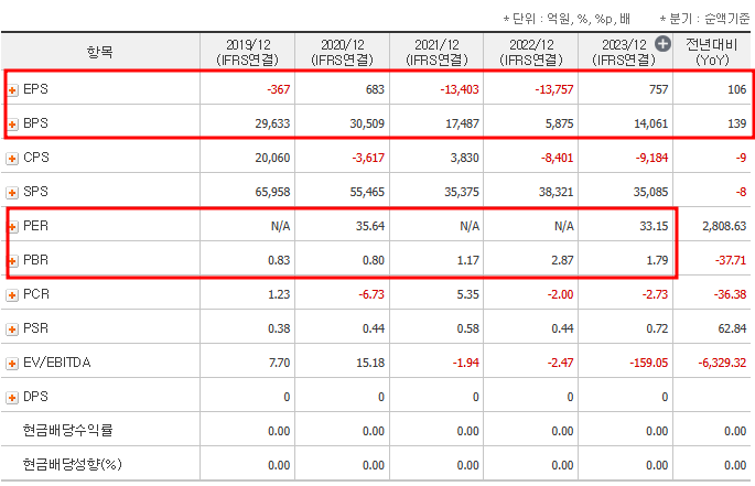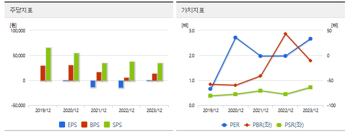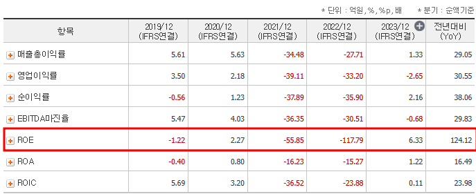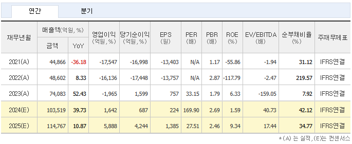 • 2023년(예상): 매출액 74,083억 원, 영업손실 -1,965억 원, 당기순이익 1,599억 원으로 예상되며, 턴어라운드의 가능성이 관측됩니다.
