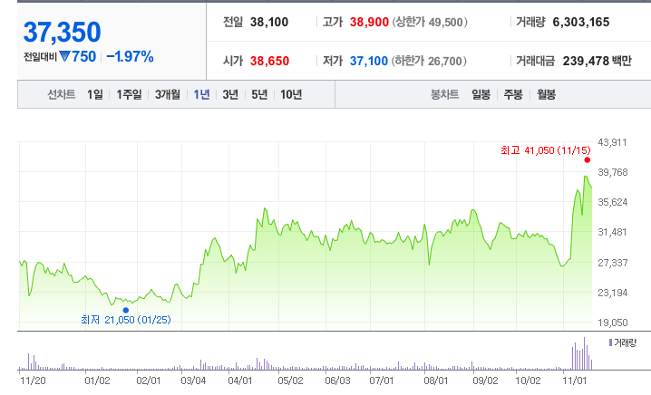 2024년 11월 19일 기준, 한화오션(코스피: 042660)의 주가는 전일 대비 250원(-0.66%) 하락한 37,850원으로 마감되었습니다. 이날 주가는 최고 38,900원, 최저 37,100원 사이에서 등락을 보였습니다. 거래량은 5,966,454주로 비교적 높은 수준을 기록했으며, 거래대금은 226,841백만 원에 달했습니다.