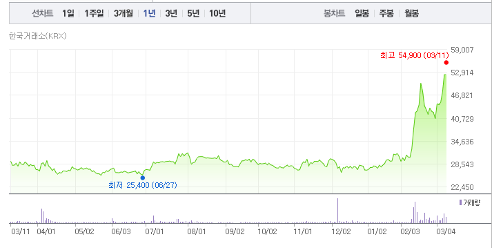 한화 주가는 52주 기준으로 작년 6월 27일에 최저가 25,400원을 기록한 후 보합세를 이루다 올해 2월 3일부터 상승세를 타기 시작했습니다.  그리고 3월 11일에 52주 최고가 54,900원에 거래되었습니다.