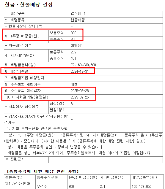 1주당 배당금 보통주: 800원 / 우선주: 850원