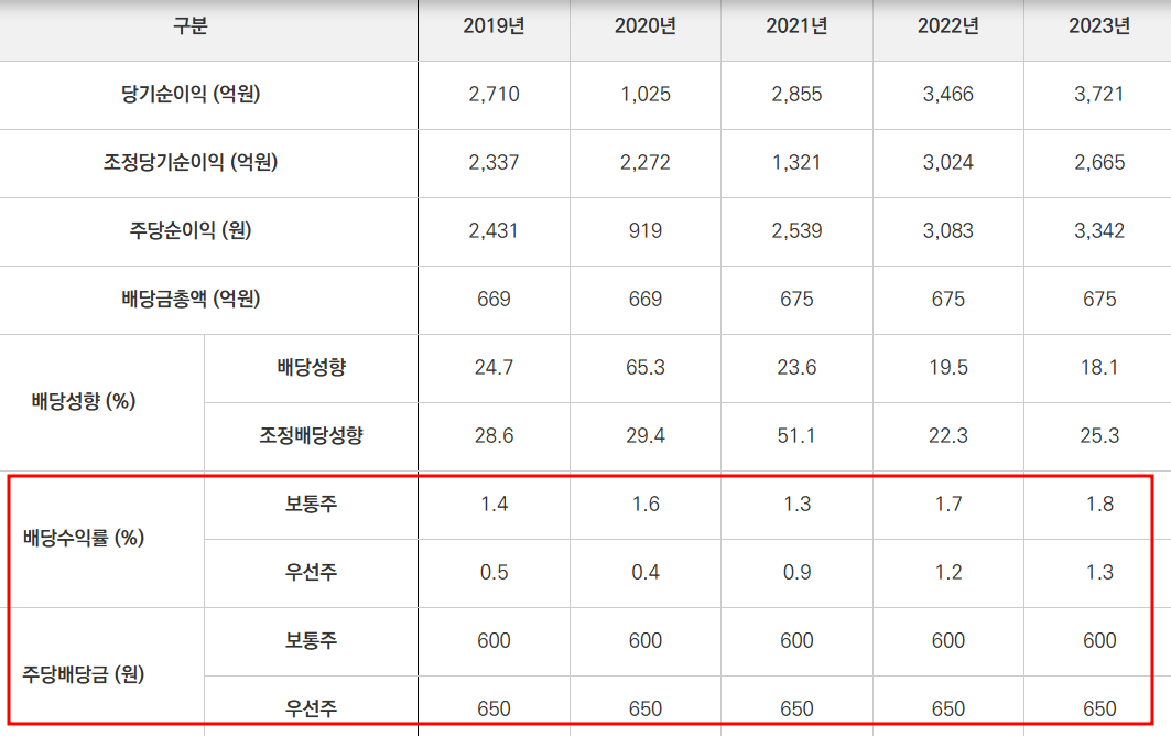 | 시가배당률 | 보통주: 1.7% / 종류주: 1.9% |