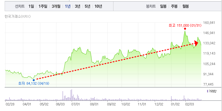 현대글로비스 주가는 52주기준으로 작년 4월에 최저가를 기록한 후 계속 상승 추세를 이어오다 지난 1월 31일에 52주 최고가인 151,000원을 기록했습니다. 이후 보합세를 유지하고 있습니다.