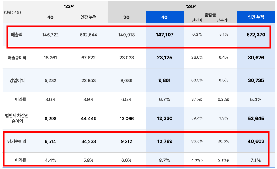 특히 4분기에는 매출이 소폭 상승한 14조 7,106억 원을 기록하며 영업이익과 당기순이익도 각각 9,861억 원과 1조 2,788억 원으로 개선되었습니다.