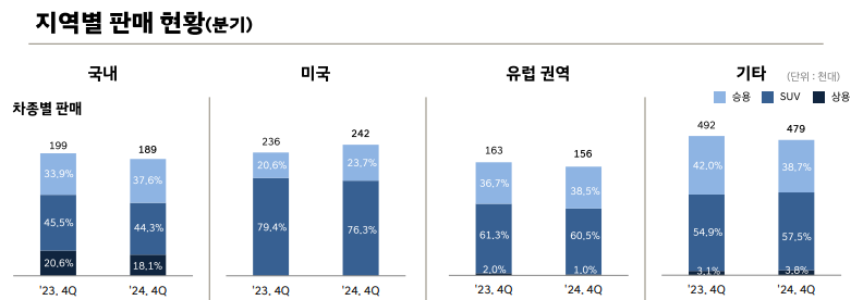 다만, 글로벌 경기 불확실성과 환율 변동으로 인해 영업이익은 일부 감소하였으며, 특히 4분기 환율 변동성이 확대되면서 판매보증충당부채 관련 비용이 증가한 것이 원인으로 분석됩니다. 현대차는 이러한 외부 변수에도 불구하고, 북미 현지 생산 확대 및 판매 전략 최적화를 통해 수익성을 방어하며 지속 가능한 성장을 이어갈 계획입니다.