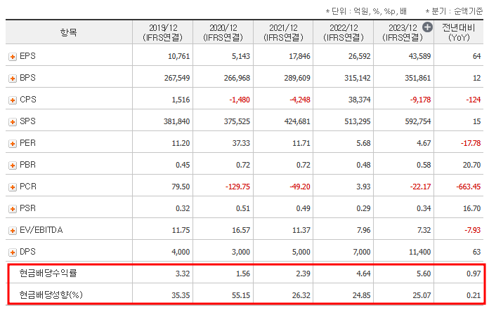 | 연도 | 보통주 배당금 (원) | 배당수익률 (%) | 배당성향 (%) |