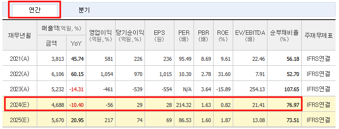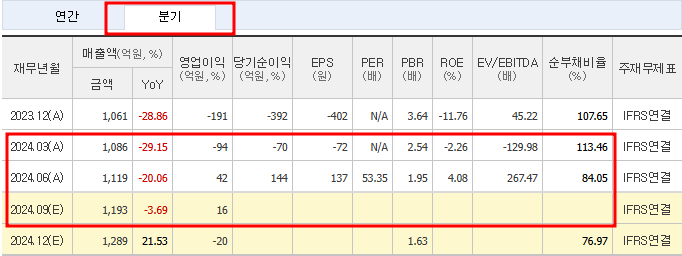 2024년 1분기 실적 예상치를 보면, 매출은 1,086억 원으로 전년 대비 29.15% 감소할 것으로 보이며, 영업이익은 -94억 원, 순이익은 -70억 원으로 여전히 적자가 예상됩니다. 그러나 2024년 하반기부터는 매출 회복과 함께 실적이 다소 개선될 가능성이 있으며, 이는 반도체 및 전자 산업의 회복 여부에 달려 있습니다.