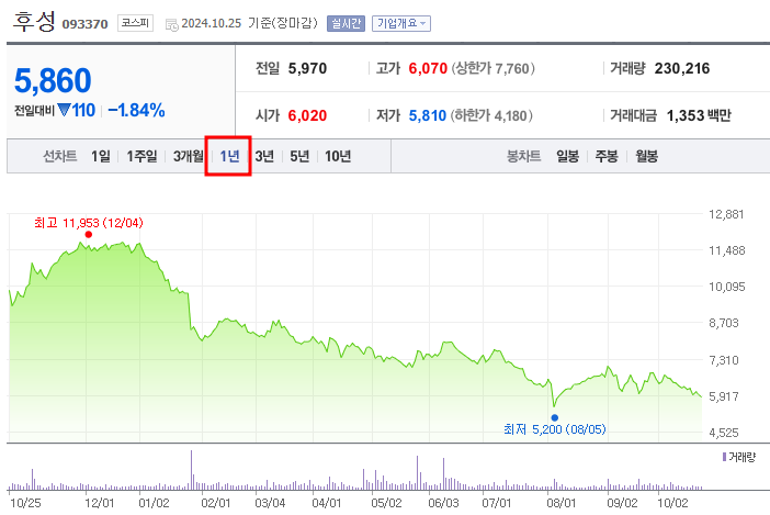 2024년 10월 25일 후성의 거래량은 230,216주로, 총 거래대금은 약 13억 5,300만 원입니다. 최근 몇 주간 후성의 주가는 꾸준한 하락세를 보이며, 특히 이날 하락폭은 시장에서 투자자들의 매도세가 강하게 작용했음을 보여줍니다.