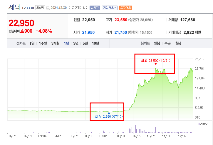 코스닥과 코스피 상장 종목 중에서 주가 상승률이 가장 높은 기업은 화장품 전문기업인 제닉이었습니다. 52주 최저가 2,880원을 기록했다가 8월말부터 주가가 상승하기 시작해서 52주 최고가인 25,500원을 기록했고 22,950원으로 2024년 장을 마감했습니다.