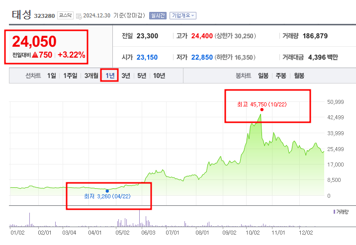 PCB 핵심 설비 제조업체인 태성은 올해 4월 22일 52주 최저가 3,260원을 기록한 후 지속적으로 상승해서 올해 10월 22일에 52주 최고가인 45,750원을 기록했습니다. 최종적으로 24,050원을 기록하며 연초대비 515% 주가 상승률을 기록했습니다.