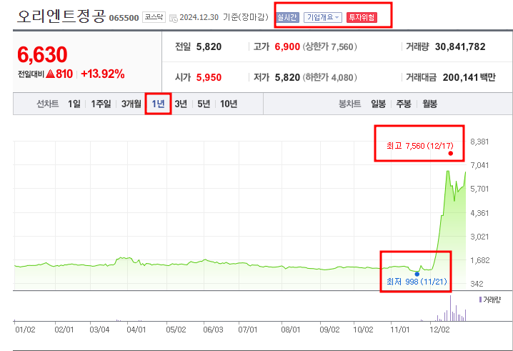 오리엔트정공은 연말까지도 상승장을 이어갔는데 정치 테마주로 분류되며 올해말부터 주가가 상승하기 시작해서 연초대비 450.66% 상승하며 2024년 장을 마감했습니다. 다만, 테마주에 따른 단기 상승으로 주의할 필요가 있습니다.