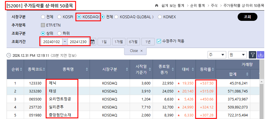 한국거래소 정보데이터시스템에서 조회기간을 2024년 1월~12월까지로 설정하고 시장구분을 코스닥으로 지정해서 상승률 높은 종목을 조회해봤습니다.