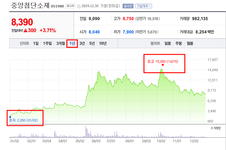 중앙첨단소재는 2023년부터 사명을 변경하고 전해액 제조사 엔켐과 함께 이디엘을 공동 설립해서 2차전지 소재 유통 사업을 전개하고 있습니다. 연초 대비 주가 상승률은 약 307%로 코스닥 시장에서 5위에 올랐습니다.