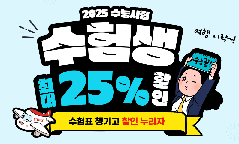 - 예약 방법: 티웨이항공 홈페이지에서 예약 시 '수험생 최대 25% 할인' 선택.