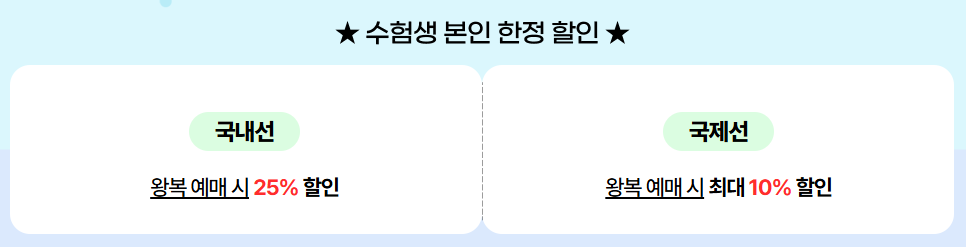 - 탑승 조건: 출발 당일 공항 카운터에서 수험표나 대입 원서 접수증, 대입 지원서(수시 포함) 중 한 가지 증빙서류를 제출.