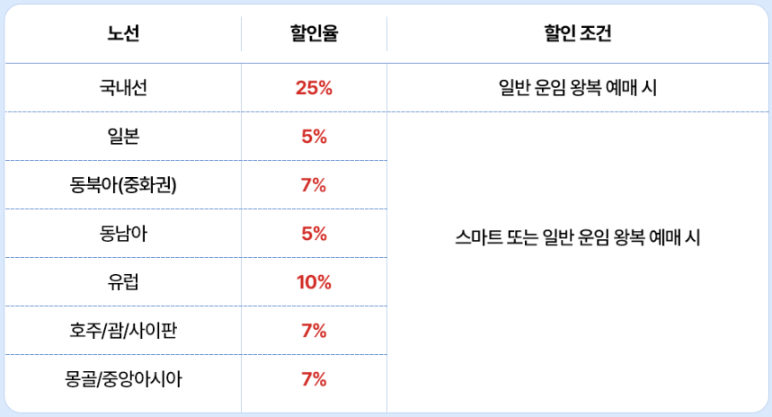 - 할인율: 국내선 25%, 국제선 최대 10% 할인.