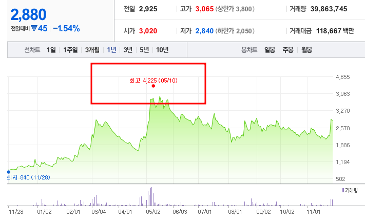 • 52주 최고가/최저가: 4,225원/849원