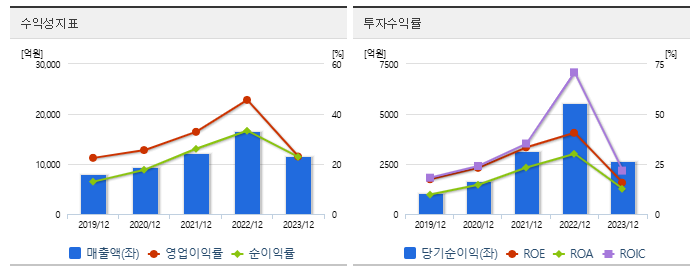2023년에는 매출 감소와 함께 영업이익 및 순이익이 감소했지만, 여전히 상대적으로 높은 수익성을 유지하고 있습니다.