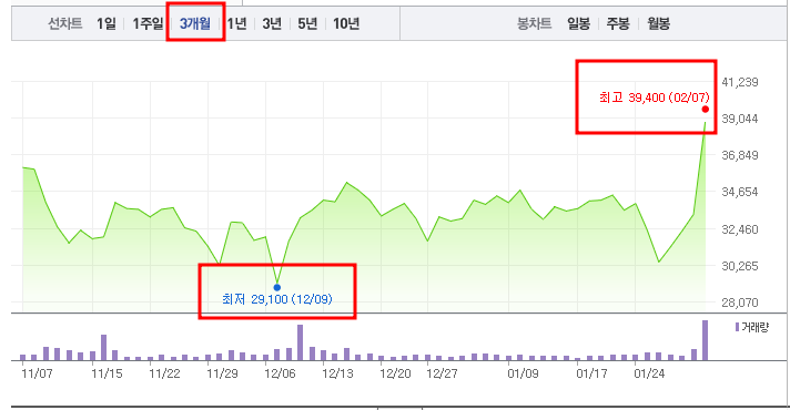 2025년 2월 7일 오전 10시 16분 기준, DB하이텍(000990) 의 주가는 38,800원으로 전일 대비 16.52% 상승했습니다. 주가는 최근 33,300원에서 39,400원 사이를 오가며 급등하며 52주 신고가를 기록했습니다.
