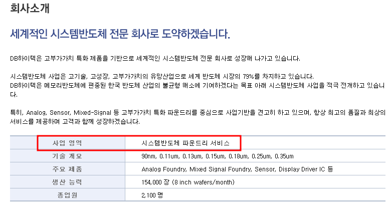 DB하이텍은 1953년 설립된 대한민국의 대표적인 시스템반도체 전문 기업입니다. 주요 사업 분야는 웨이퍼 수탁 생산 및 판매를 담당하는 파운드리 사업과 디스플레이 구동 및 센서 IC 등 자사 제품을 설계, 판매하는 브랜드 사업입니다.