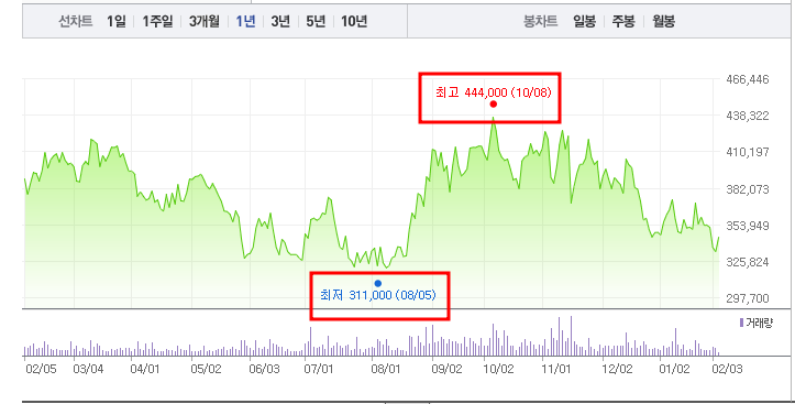 • 52주최고가/최저가: 444,000원/311,000원