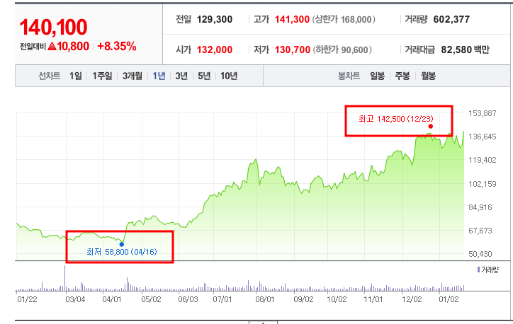 - 52주 최고가: 142,500원 (2024년 12월 23일)