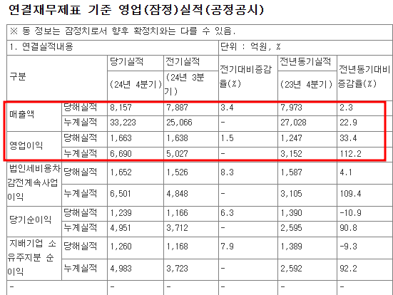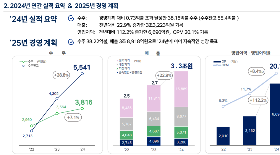 HD일렉트릭은 지난 6일 공시를 통해서 2024년 매출 및 실적발표를 했습니다. 간략하게 살펴보면, 매출액은 전년 대비 약 22% 증가한 3조 3223억원을 기록했고 영업이익은 6,690억원을 기록하며 전년 동기 대비 약 112% 성장했습니다.