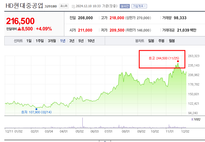 2024년 12월 10일 기준, HD현대중공업의 주가는 전 거래일 대비 4.09% 상승한 216,500원으로 마감했습니다.