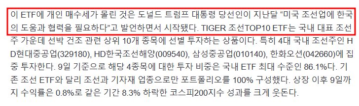 최근 조선업에 대한 긍정적인 전망과 함께 거래량이 증가했으며, 특히 조선 관련 ETF(TIGER 조선TOP10 ETF)에 투자자들이 관심을 보이고 있습니다.