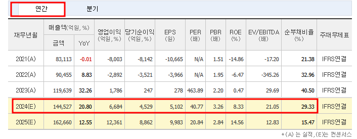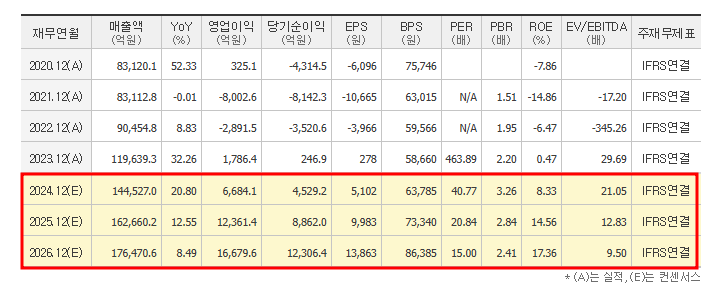 - 2024년(E) 매출: 144,527억 원, 영업이익 6,684억 원 전망.