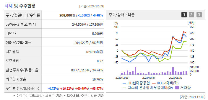 국내 조선업의 대표 기업인 HD현대중공업(329180)의 현재 주가는 216,500원에 거래되고 있습니다. 트럼프 당선인이 미국조선업에 한국의 도움이 필요하다고 발언한 것도 주가에 영향을 미친 것으로 보입니다. 이번 글에서는 HD현대중공업의 주가 전망과 기관에서 예측한 목표주가, 실적, 배당금에 대해서 알아보겠습니다.