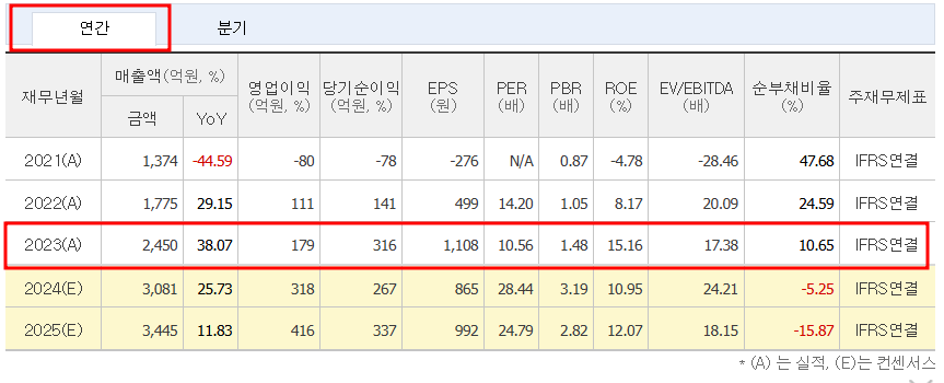 - 2023년 매출액: 2,450억 원 (+38% YoY)