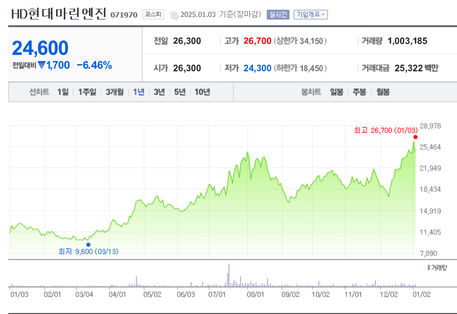 2025년 1월 3일 기준, HD현대마린엔진(종목코드: 071970)의 주가는 24,600원으로 전일 대비 6.46% 하락한 모습을 보였습니다. 최근 1년간 주가는 꾸준히 상승세를 유지하며 2024년 3월 최저점인 9,600원에서 2025년 1월 3일 기준 26,700원까지 상승하며 최고점을 기록했습니다. 이는 약 178%의 상승률을 보인 것입니다.