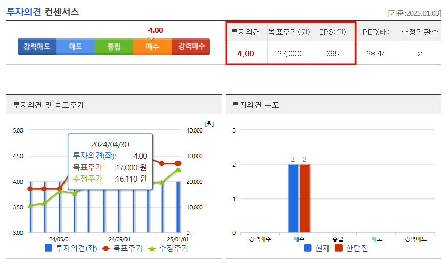 신영증권과 DS투자증권에서 제시한 목표주가는 27,000원이고 투자의견은 4.00으로 매수의견입니다.